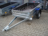 Przyczepa dwuosiowa na kat. B. Przyczepy dostępne w różnych rozmiarach, na zdjęciach widoczna przyczepa o wymiarze wewnętrznym skrzyni ładunkowej 263x125x35cm. Przyczepy te są wyposażone w dwie osie po 750kg wytrzymałości każda. Przyczepy homologowane są w zakresie od 500kg do 750kg, jako przyczepy lekkie, do których nie jest wymagana kat. E.
